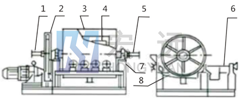 1. 進(jìn)水口 2. 驅(qū)動(dòng)部分 3. 轉(zhuǎn)鼓 4. 冷卻系統(tǒng) 5. 出水系統(tǒng) 6. 刮刀系統(tǒng) 7. 機(jī)架 8. 料盤 |