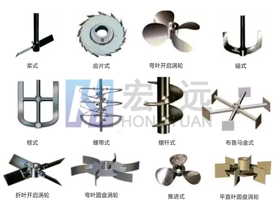在攪拌過程中,一般認為粘度小于5Pa/s的為低粘度流體,例如水、蓖麻油,飴糖,果醬,蜂蜜,潤滑油重油、低粘乳液等;5-50Pa/s的為中粘度流體,例如油墨、牙膏等;50-500Pa/s的為高粘度流體,例如口香糖、增塑溶膠、固體燃料等;大于500Pa/s的為特高粘流體,例如:橡膠混合物、塑料熔體、有機硅等。對于低粘度介質(zhì),用小直徑的高轉(zhuǎn)速的攪拌器就能帶動周圍的流體循環(huán),并至遠處。而高粘度介質(zhì)的流體則不然,需直接用攪拌器來推動,相應(yīng)需要加大攪拌電機功率。適用于低粘和中粘流體的葉輪有槳式、開啟渦輪式,推進式,長薄葉螺旋槳式、圓盤渦輪式、布魯馬金式、板框槳式、三葉后彎式等。適用于高粘和特高粘流體的葉輪有螺帶式葉輪、螺桿式、錨式、框式、螺旋槳式等。